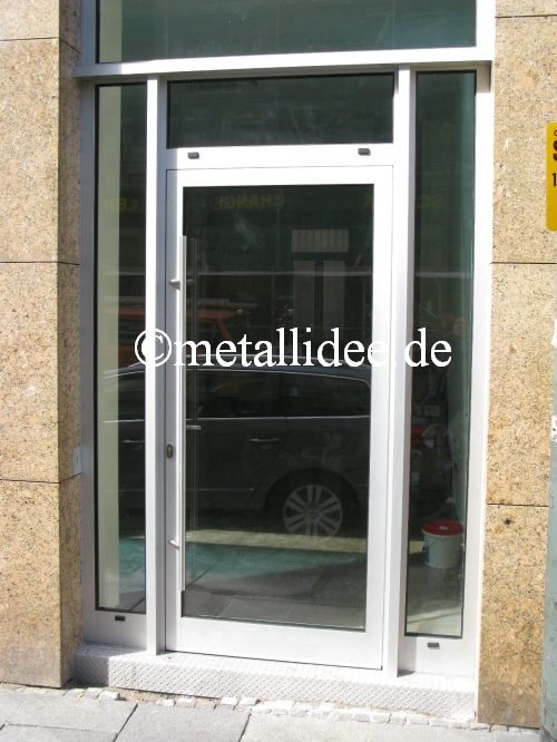 Eine stabile Alu Eingangs Konstruktion mit Stoßgriff, Drücker, SI-Verriegelung und festem Oberlicht.