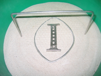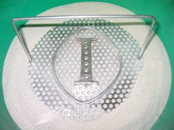 Loesung Metallidee #250: Ein Edelstahl Lochblech mit Rund als Bügel und Ials Firmenemblem lose in den Aschenbecher eingelegt